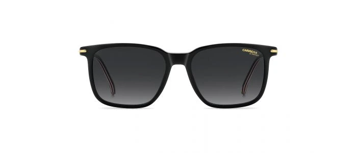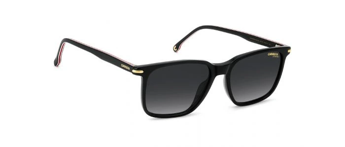 Le Carrera 367/S OIT est une paire de lunettes de soleil rectangulaires pour homme, avec monture en acétate noire rehaussée de touches rouges. Verres à teinte dark grey shaded, avec protection UV intégrale.