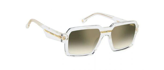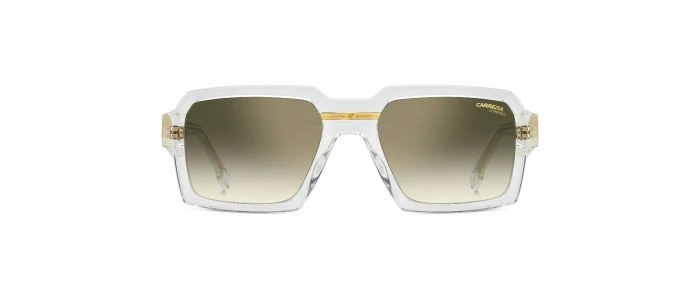 Le modèle Victory C 15/S REJ de Carrera est une paire de lunettes de soleil rectangulaire unisexe. La monture est en plastique transparent doré (Crystal Gold) avec des accents métalliques raffinés, combinée à des verres teints verts miroir doré.