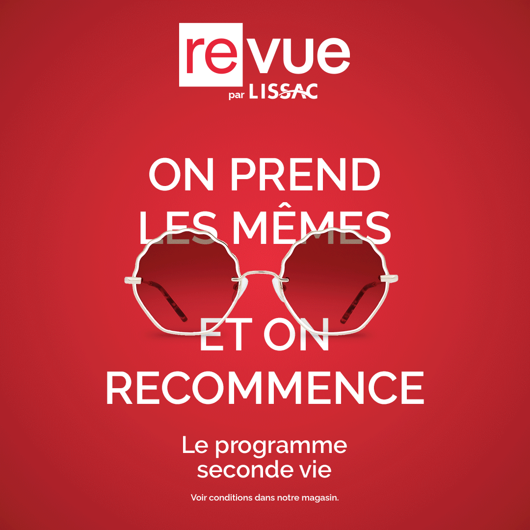 Mentions légales : Dans le cadre du programme « Revue par Lissac », votre opticien vous propose des prestations de réparation selon l’état de vos montures optiques ou solaires (voir tarification et conditions en magasin). Pour en savoir plus sur le programme « Revue par Lissac » et connaître la liste des magasins participants au programme : https:// www.lissac.fr/revue-par-lissac. Dispositif médical CE. Demandez conseil à votre opticien.